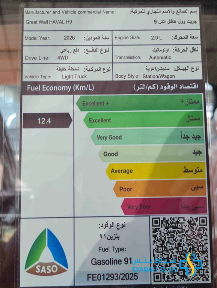 هافال إتش9 هاي فل 2026 الجديده كليا . امتلكها الان و تمتع بقياده فريده . الالوان المتوفره حسب المخزون . الاسعار تختلف حسب الالوان المتوفره . تمويل عروض تقسيط سيارات عائليه . سياره بلس-Syarah plus