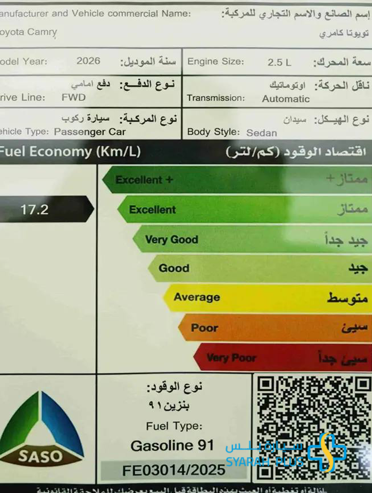 تويوتا كامري إي بنزين 2026 الجديده كليا . امتلكها الان و تمتع بقياده فريده . الالوان المتوفره حسب المخزون . الاسعار تختلف حسب الالوان المتوفره . تمويل عروض تقسيط سيارات عائليه . سياره بلس-Syarah plus